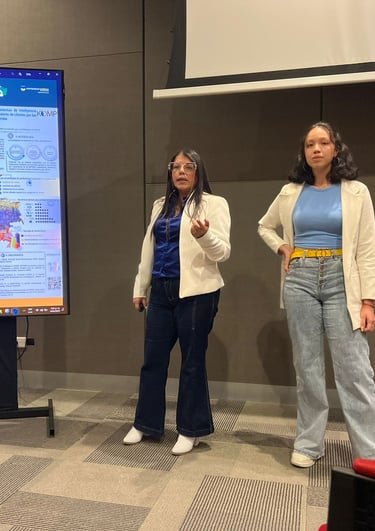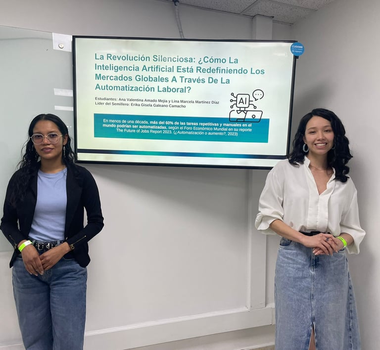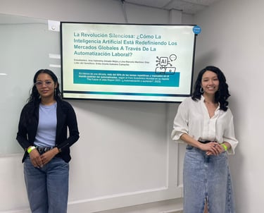 Las estudiantes Ana Valentina Amado Mejia y Lina Marcela Martínez Díaz con su ponencia titulada "La Revolución Silenciosa: ¿Cómo la Inteligencia Artificial está redefiniendo los mercados globales a través de la automatización laboral?"